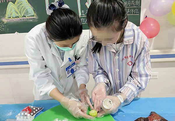 活动现场,医护人员为患者讲解月饼的制作方法,并为患者分发了食材、月饼模具、手套等,医患亲自动手制作月饼,有的擀面皮,有的包馅料,有的按模子压制,忙得不亦乐乎。虽然是第一次做月饼,但大家做得有模有样,并纷纷表示:亲自动手做的月饼味道就是跟买来的不一样,这里面包裹的不仅仅是普通的馅料,还有那浓浓的医患情和亲力亲为的满足感。