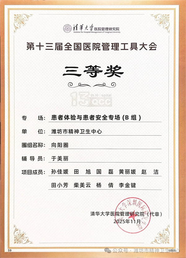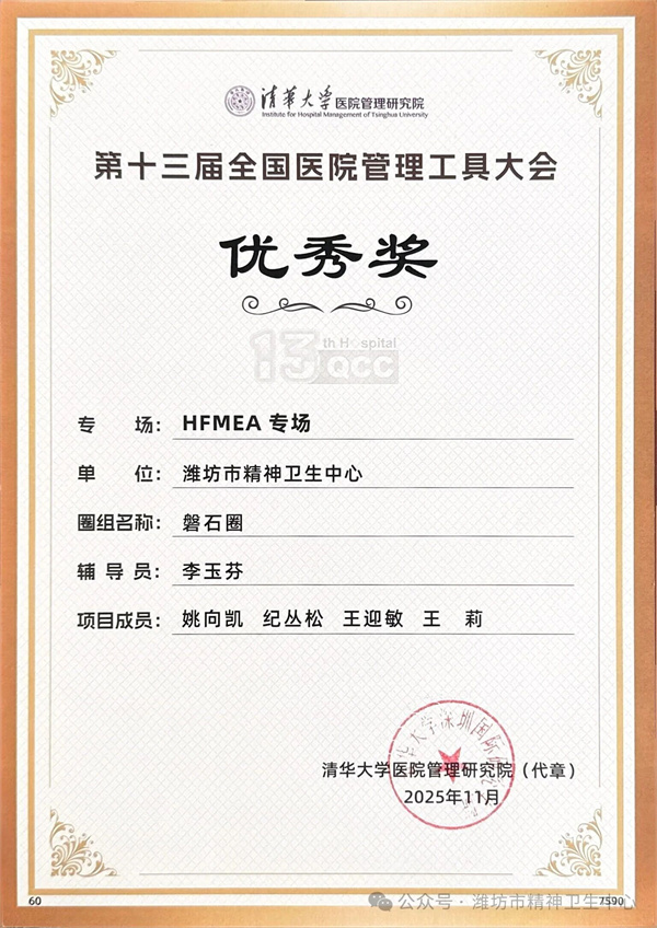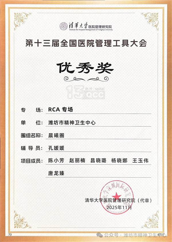 此次获奖是对医院质量管理工作的肯定,也是鼓励。医院将以此为契机,充分发挥品管圈等管理工具的抓手作用,激发团队创新活力,精准识别问题,靶向施策,不断提升服务品质与安全水平,全力打造专业、优质、高效的心理健康服务品牌。