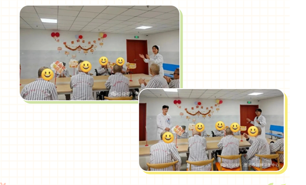 在趣味游戏环节,医护人员精心设计了“水杯快跑”“眼疾手快”“报纸拉球”等适老化游戏。这些游戏看似简单,却能有效锻炼老人的反应力与手眼协调能力。现场老人们参与踊跃,阵阵喝彩与欢声笑语,让病房充满了欢快的气氛。