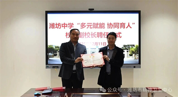 12月11日,医院与潍坊中学正式签署心理健康“医教协同”项目合作协议,医院党委委员、副院长王旭光与潍坊中学党委书记张年勇代表双方完成签约,并聘任医院心理咨询中心副主任孟亮亮担任学校校外心育副校长。