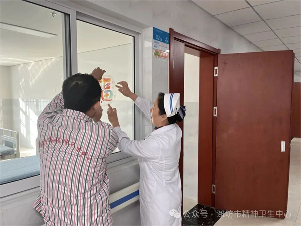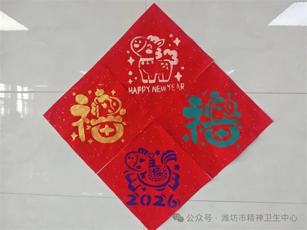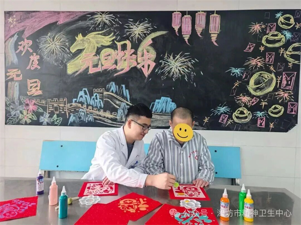病房里,大红窗花映笑脸,欢声笑语迎新年。在医患联欢会上,大家齐唱新年歌曲、分享新年愿望,亲手贴上的窗花不仅装饰了病房,更将节日的喜庆带到了每位患者心间。精神一科的“拓福印”活动更是热闹非凡——在医护人员的耐心指导下,患者们亲手拓印出一张张寓意吉祥的“福”字,墨香中传递着对新年的美好期盼。每一份作品的完成,都是一次专注力的凝聚、一次手脑协调的锻炼,更是一次康复信心的提升。