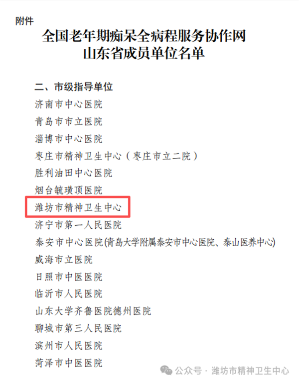 近日,山东省卫生健康委员会与省疾病预防控制局联合发布了《全国老年期痴呆全病程服务协作网山东省成员单位名单》。医院成功入选全国老年期痴呆全病程服务协作网市级指导单位。
