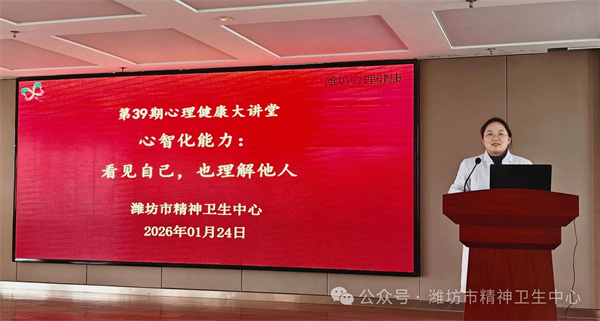 1月24日,医院举办第39期“心理健康大讲堂”。本期讲堂以《心智化能力:看见自己,也理解他人》为主题,由心理治疗师范佳愉主讲,吸引了心理学爱好者、市民及患者家属等60余人参与。