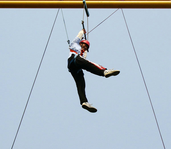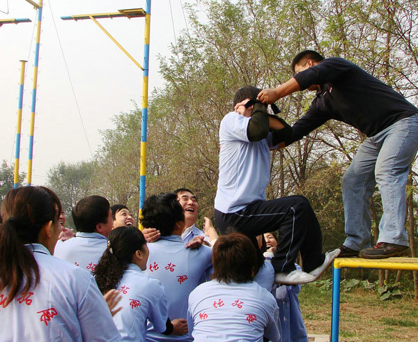 在教练的带领下,32名队员确定了队名、队训、并且谱写了队歌,推选了队长、队秘、共同制作了队旗。在2天的时间里,队员们感受颇深: “背摔”的信任和责任、“跳抓单杠”的超越极限和超越自我、“穿越电网”的细节决定成败、“盲人方阵”的合理分工和资源有效配置、“孤岛求生”的沟通和配合、“天梯、毕业墙”的团队协作与智慧……