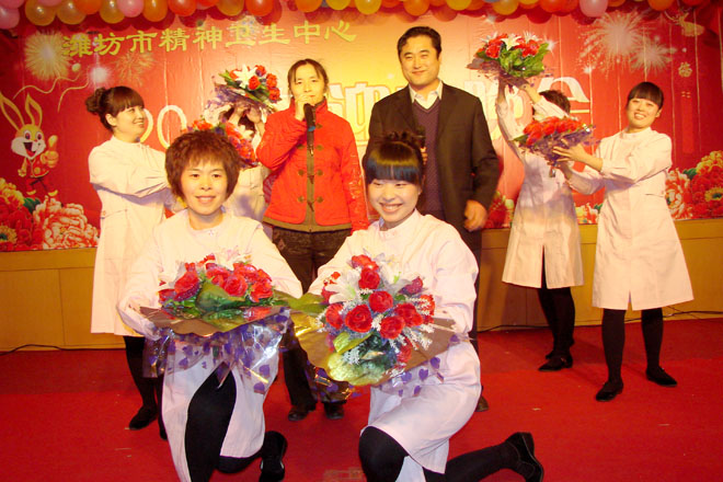 1月25日晚,潍坊市精神卫生中心2011年迎春文艺晚会在我院病房楼五楼会议室隆重举行。高高挂起的灯笼、七色的彩花、五颜六色的气球以及大红的幕布为舞台披上了节日的盛装。冬日的寒意丝毫没有影响职工对晚会的热情,整个会议室喜气洋洋,座无虚席,大家欢聚一堂,共迎新春佳节。